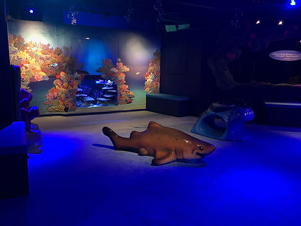 The mural above to the right is installed on the perpendicular wall to the right of the mural above to the left, continuing the underwater cove environment theme. This part of the mural depicts seaweed, invertebrates, rays, and sharks that are native to the deeper water of the cove. The blue square designates the area that is covered by a monitor that will have an animated turtle that interacts with the audience. When not in use for the interactive show the monitor will have slides that have suggested ways to engage the visiting children.